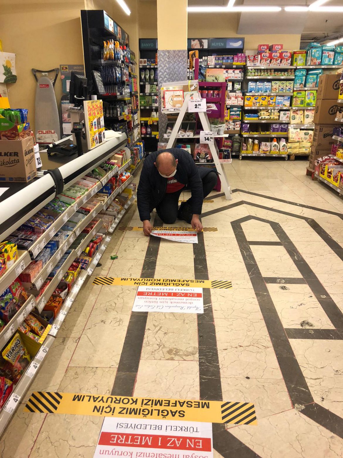 Corona virüsü salgınına karşı seferberliğimiz devam ediyor.İlçemizde ki marketlere Sosyal Mesafe yönergeleri…