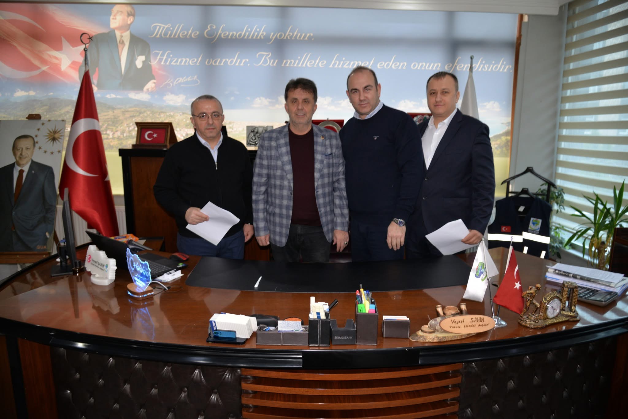 Dr. Sinan Altıkulaç ve Özel Nefes Hastanesi Yönetim Kurulu Üyesi Yaşar Çelik, Belediye Başkanımız Veysel Şahin’i ve İnsan Kaynakları ve Eğitim Müdürümüz Naci Özdemir’i başkanlık makamında ziyaret ettiler.